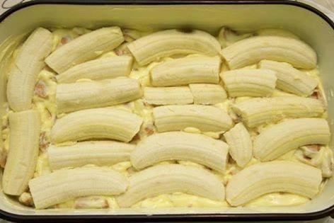 Во плех со средна величина и премачкан со тенок слој путер, излејте половина од смесата, преку неа наредете банани пресечени надолжно, една покрај друга, па врз нив истурете го остатокот од смесата. Ставете во фрижидер убаво да излади и да се стегне.