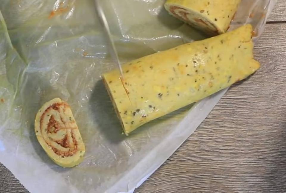 Тестото замесете го со оригано, па како и претходното тесто развлечете го помегу два листа масна хартија со помош на оклагија. Измешајте ја туната и кечапот па премачкајте и свиткајте во ролат. Оставете да излади.