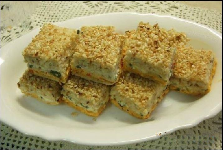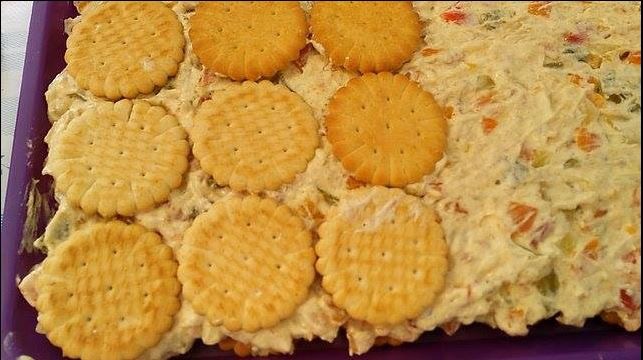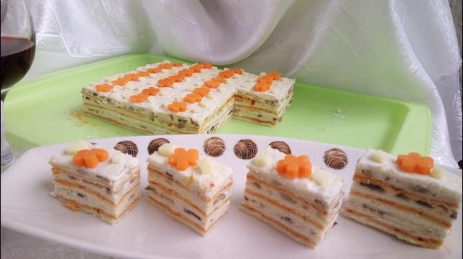 ПОСНА ТОРТА СО КРЕКЕРИ – Потребни состојки: 300 г посни крекери, 150 г маргарин, 200 г посен мајонез, 1 лажица сенф, 2-3 кисели краставички, 2 варени моркови, 2 варени компири, 50 г печен сусам и 50 г печени кикирики