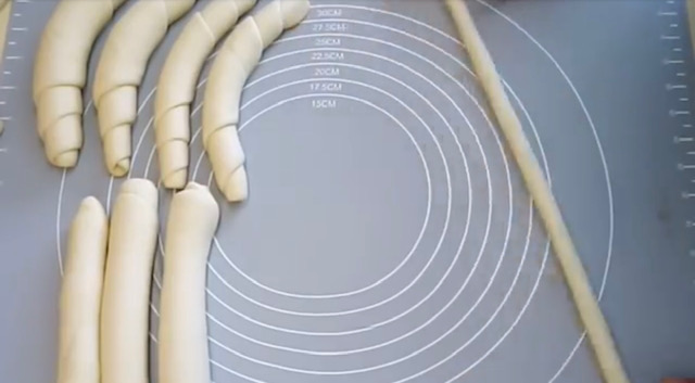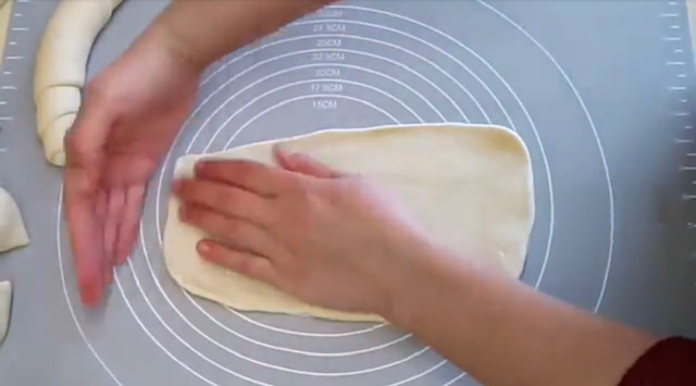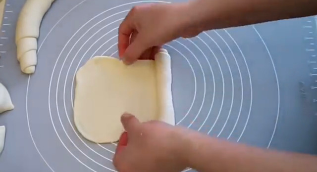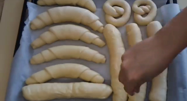 За кифли: развлечете кора со форма на триаголник, па свиткајте ја во вид на кифла. За француски сендвич: развлечете ја кората во форма на правоаголник, свиткајте ја во цилиндар и уште малку со дланките развлечете. За перек: од парче тесто исукајте долго и тенко валјаче и потоа свиткајте го во вид на перек.