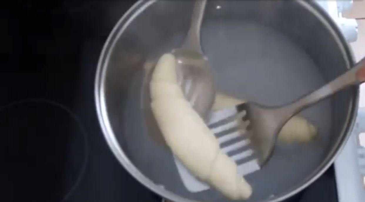 Откако ќе ги направите кифлите, во тенџере со зовриена вода ставете сода бикарбона. Секоја кифла варете ја во врелата вода околу 10-тина секунди и вадете ја со решеткаста лажица. Потоа редете ги во плех обложен со харѕија за печење.