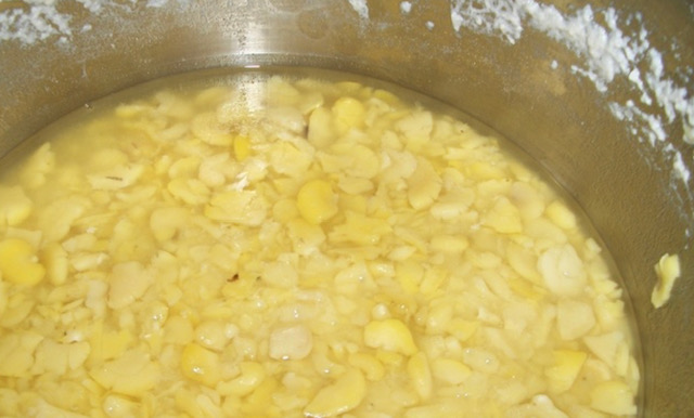 Постапка: Гравот измијте го и ставете го во еден сад, а потоа прелијте го со врела вода. Оставете да стои на топло додека да набубри и речиси да се удвои. Потоа излупете го, измијте го и ставете го да се вари. Треба да се меша додека се вари. Кога гравот е сварен процедете го, но сочувајте ја водата, можеби ќе ви биде потребна за подоцна.