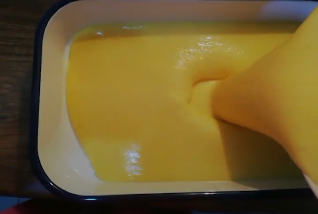 Постепено додавајте ја млаката вода и мешајте додека да добиете хомогена смеса (густа и полутечна). Смесата излејте ја плех со средна величина и ставете да се пече во загреана рерна на 200 степени.