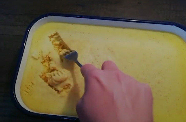 После 10 минути извадете го плехот од рерна и со виљушка промешајте го бакарданот. Вратете да го допече уште 10-15-тина минути. Откако ќе се испече убаво издробете го со виљушка и попарете го растопен путер.