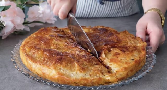 11. Откако ќе се испече, превртете го бурекот наопаку, оставете кратко да одмори, па исечете и послужете.