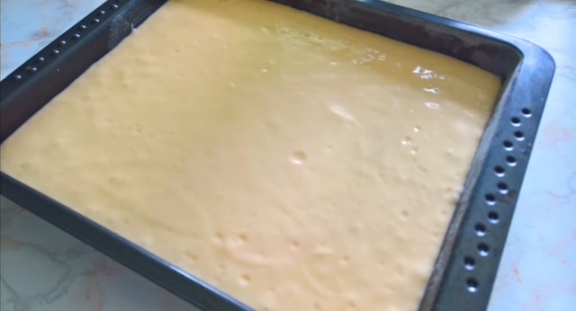 Загрејте ја рерната на 200°C. Намастете и набрашнете калап со димензии 24х22 см. Истурете ја смесата во калапот и лесно потчукнете го за да се ослободат евентуалните меурчиња од воздух.