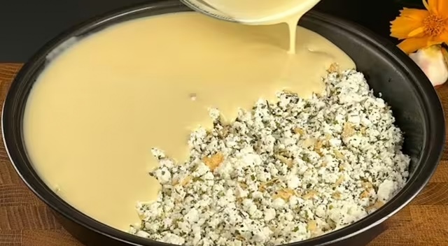 8. Извадете го калапот од рерната, рамномерно распоредете го филот од урда врз делумно испеченото тесто, а потоа прелијте ја преостанатата половина од тестото врз филот.