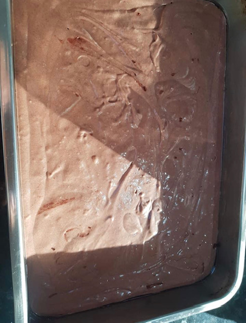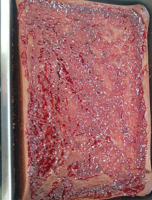 Додека е топол печениот колач одозгора премачкајте го со неколку лажици џем или мармалад по ваш избор. Додека колачот се лади на страна, пригответе ја чоколадната глазура.