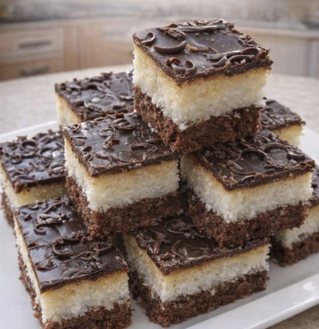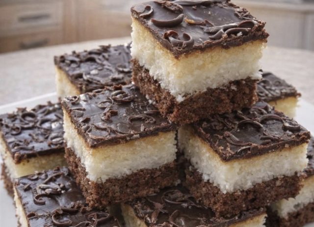 Комбинацијата од мека чоколадна кора, нежен кокос-крем и едноставна чоколадна глазура создава десерт што се подготвува лесно, а изгледа како од слаткарница.
