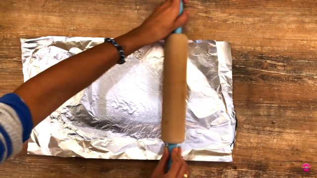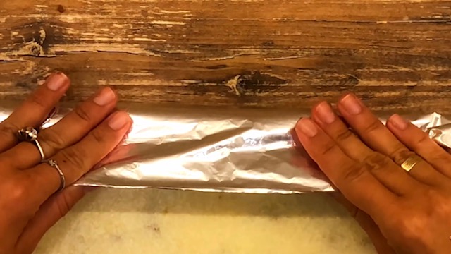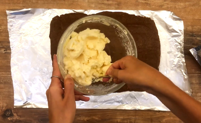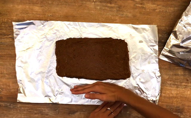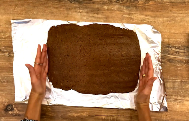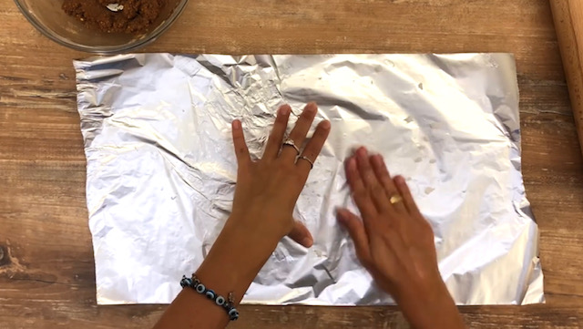 Ставете ја кафеавата смеса врз едното парче фолија и со рацете обликувајте правоаголник. Одозгора покријте го со другото парче алу-фолија, па со помош на оклагија развлечете поголема кора.