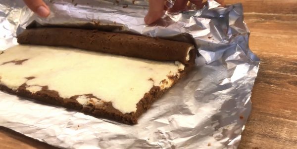 Добиениот светол фил рамномерно нанесете го врз кафеавиот дел, покријте со алуминиумска фолија и со оклагија рамномерно развлечете.