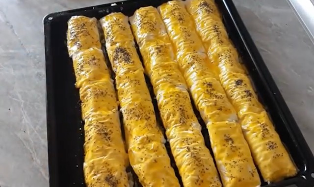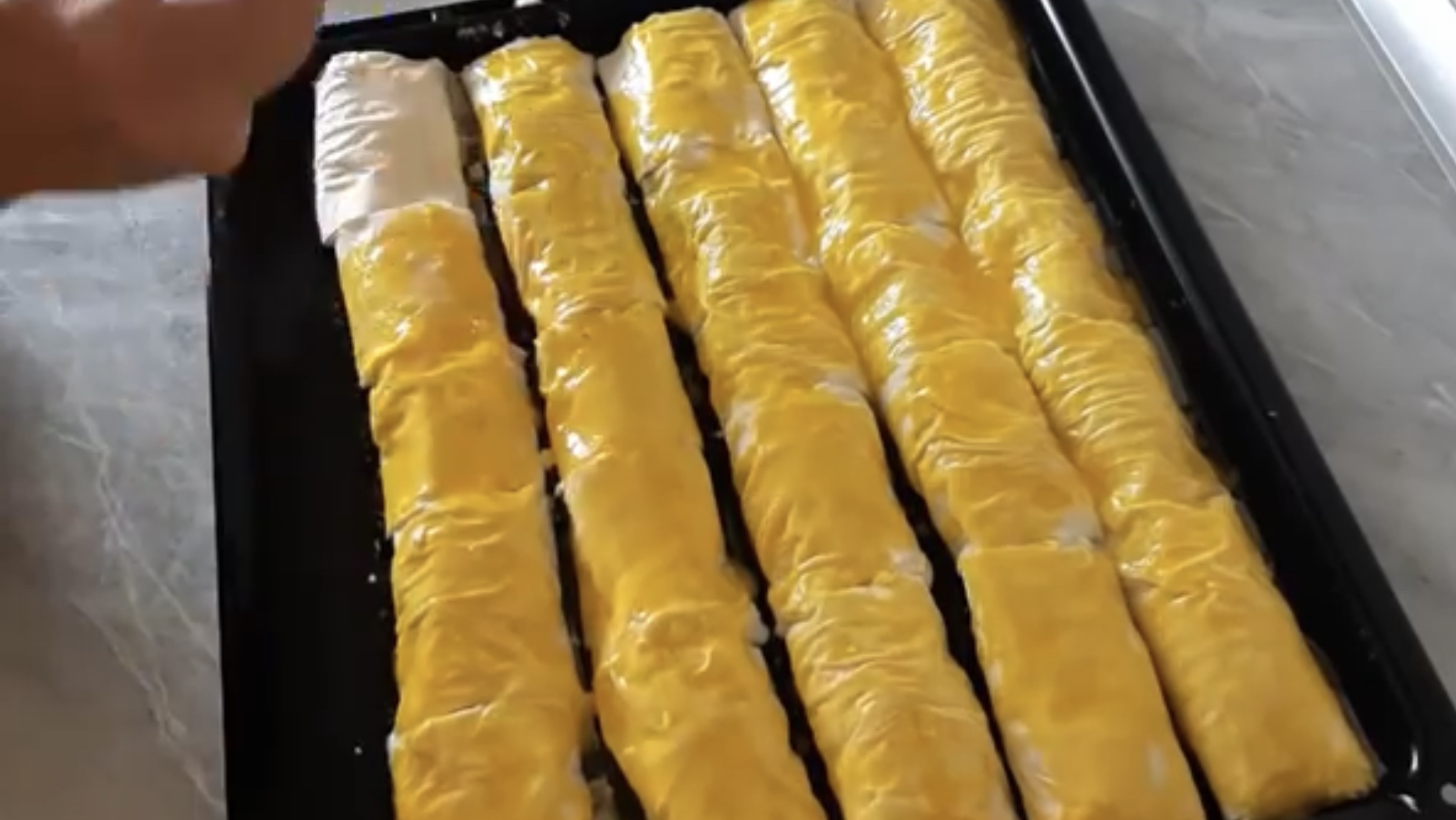 Исечете ја на прачиња со големина по ваш избор. Ставете да се пече во претходно загреана рерна на 200 степени околу половина час или додека убаво да заруменат. Кога ќе ја извадите питата премачкајте ја одозгора со малку растопен путер и оставете да излади.