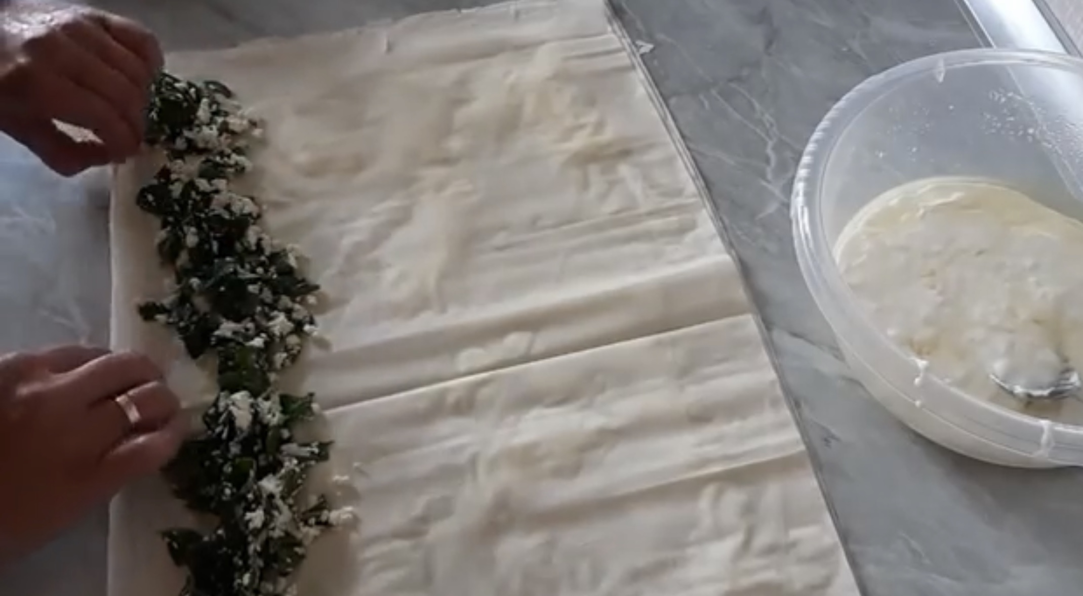 Фил со сирење и спанаќ: Во посебен сад ставете го измиениот и исечкан спанаќ, исцеден од вишокот вода и малку посолен (по вкус). Истискајте го со рацете малку за да омекне, па измешајте го со ситното сирење. Ако не е солено сирењето, посолете и измешајте со раце.