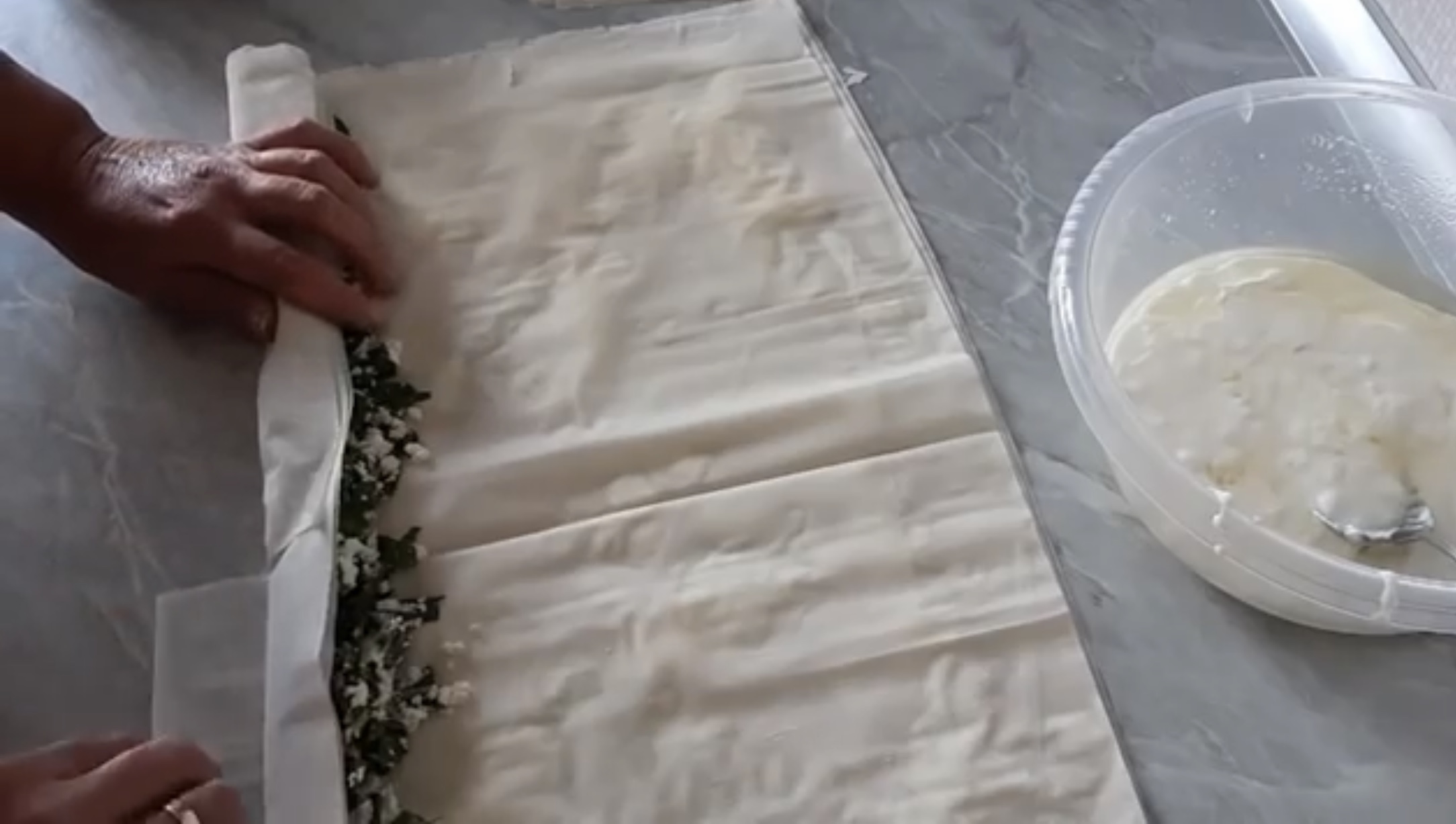 Филување на корите: Ставете една кора, нанесете од течниот фил, па ставете ја втората кора, повторно течен фил и трета кора. Врз третата кора ставете спанаќ со сирење на крајот од корите и свиткајте како ролат. Готовите ролати редете ги во тепсија. Пред печење исечете ги ролатите на парчиња.