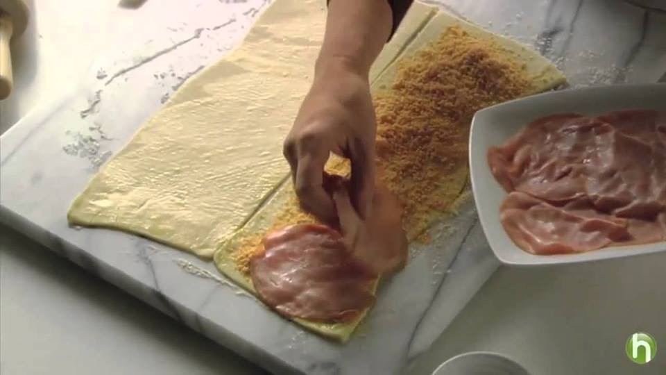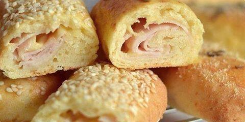 Тестото развлечете го во лист со величина од околу 36х36 см. Од него исечете квадрати 9 см. На парчињата наредете парчиња кашкавал и шунка, па свиткајте како ролат. Добро притиснете ги рабовите за да не истече кашкавалот.