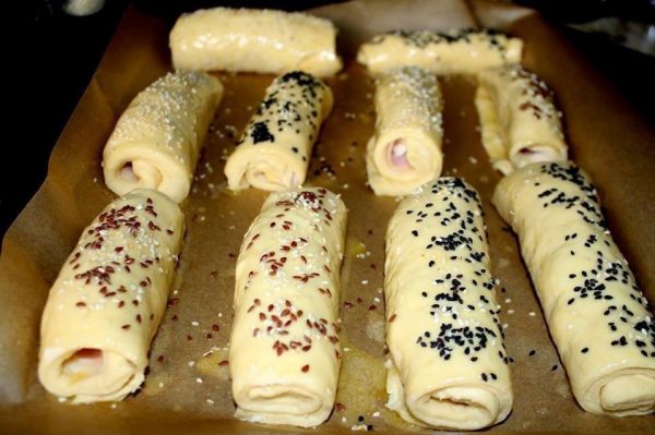 Редете ги на плах обложен со хартија, премачкајте ги со млеко, а можете и со јајце, па одозгора на наросите семки и семе, па печете во рерна на 180 степени околу 15-20 минути.