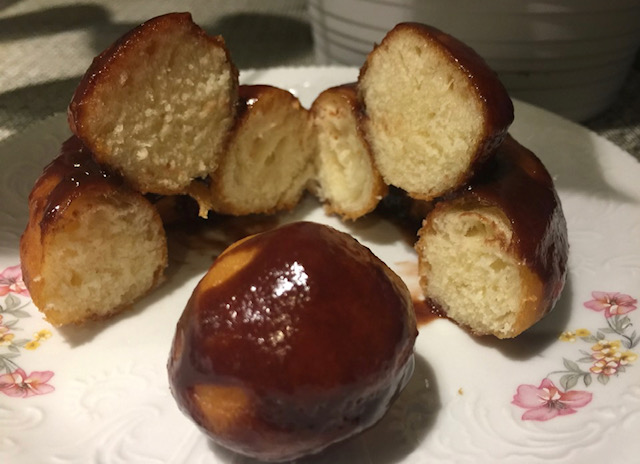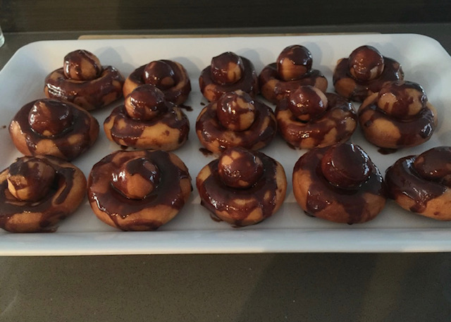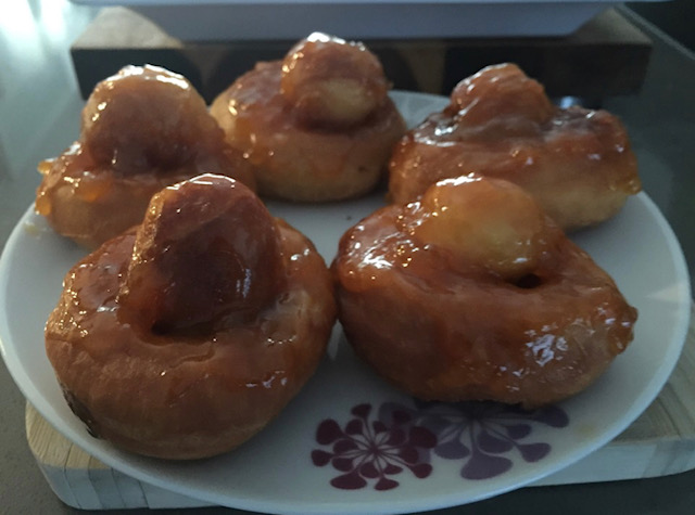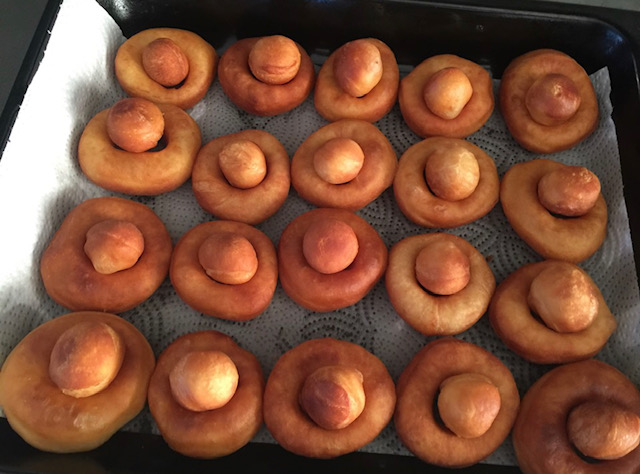 Испржените топчиња ги наредив врз прстените за да не ми фаќаат место, со што добив интересен облик и пресек на крофничките. Неколку ги полеав со мармалад од кајсии помешан со растопен путер.