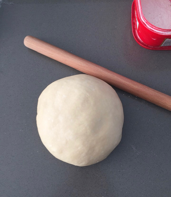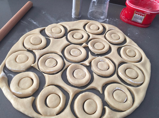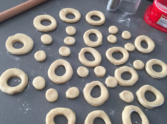 Се меша додека се изедначи, па се додава брашно со 1 прашок за печиво (не го мерев брашното, додавав додека замесив помеко тесто, мазно кое не лепи на раце). Тестото се остава да отстои десеттина минути, па се развлекува кора и со чаша и капаче се вадат прстени (воланчиња) и топчиња кои остануваат во средината.