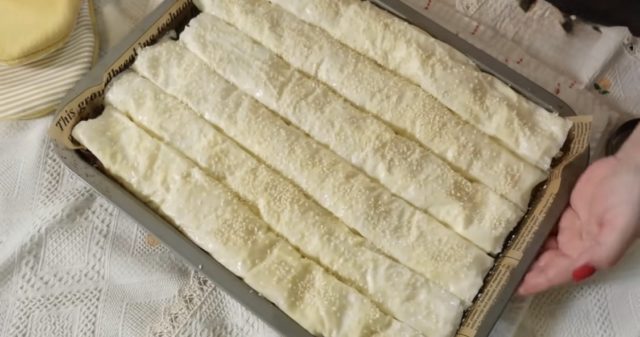 5. Печење: Посипете сусам по врвот. Печете во загреана рерна на 180°C околу 30–35 минути, додека питата добие убава златно-жолта боја и не стане крцкава однадвор.