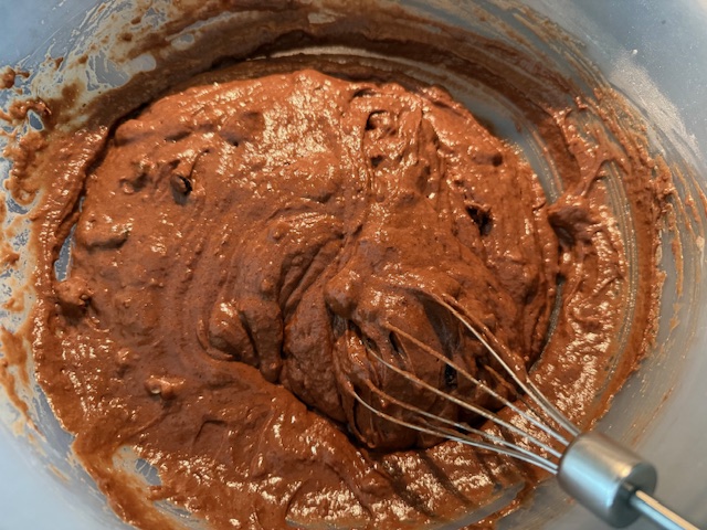 1. Во длабок сад измешајте ги сите состојки: брашно, сода бикарбона, ванилин шеќер, шеќер, вода, масло, суво грозје, сечкани ореви и какао.
