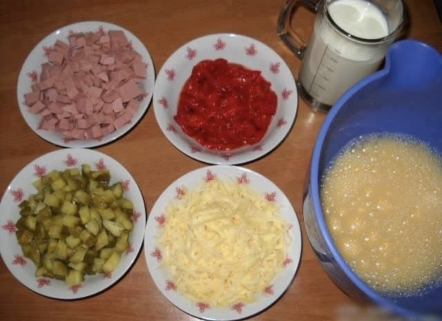 4. Шунката, сирењето, киселата црвена пиперка и киселите краставички ситно исечкајте ги и додајте ги во смесата.