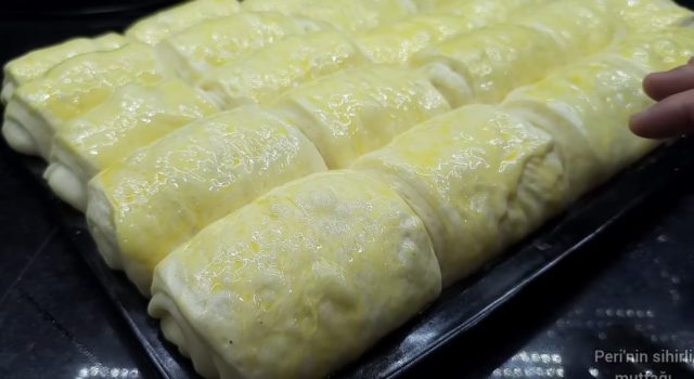 6. Полнење: Во секое парче тесто ставете долгнавесто парче кашкавал. Лесно развлечете го тестото и завиткајте го околу филот, формирајќи погачици.