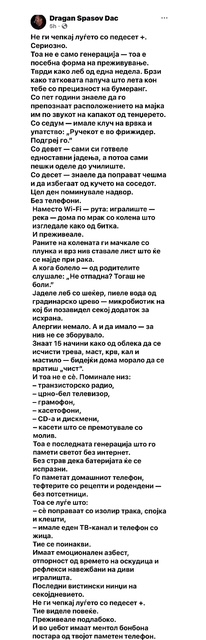 Статусот, напишан со носталгичен, но горд тон, ги опишува овие луѓе како „последните вистински нинџи на секојдневието“, кои преживеале транзиции од грамофони до дискмени, од црно-бели телевизори до свет без страв од празна батерија.