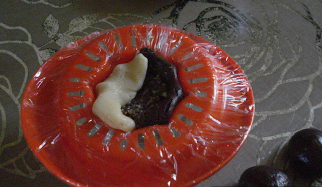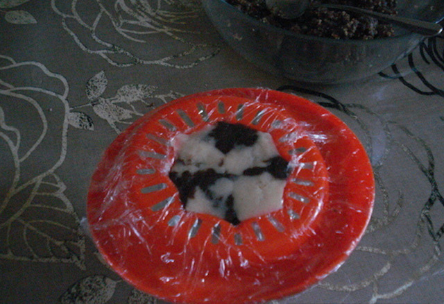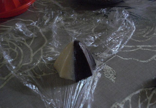 За да добиете шарен ефект, секое топче можете да го поделите на повеќе помали и да ги ставате наизменично во калапот.