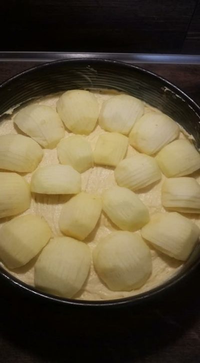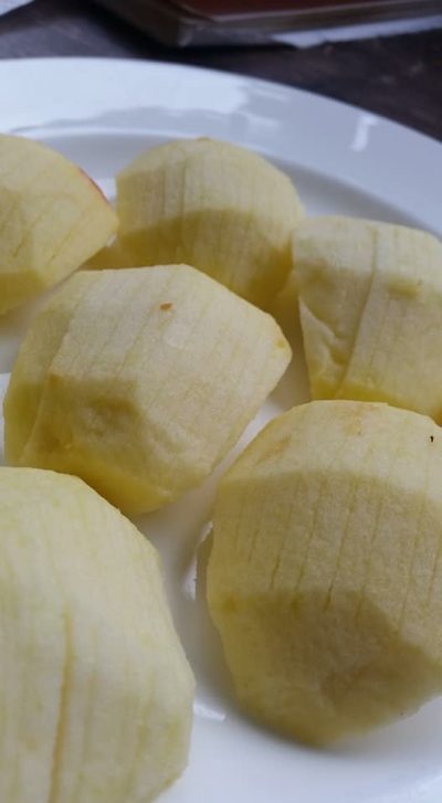 Јаболката се мијат, лупат и сечкаат на четвртинки (или половинки, по избор), а одозгора се засекуваат како лепеза. Се редат како на фотографијата.