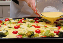 Кога ќе ги соедините овие состојки, низ сито се додаваат просеаните брашно, прашок за печиво и какаото. Потоа смесата се продолжува да се соединува со шпатула (не со миксер). Измешајте додека да се добие еднолична и течна смеса, без грутчиња.