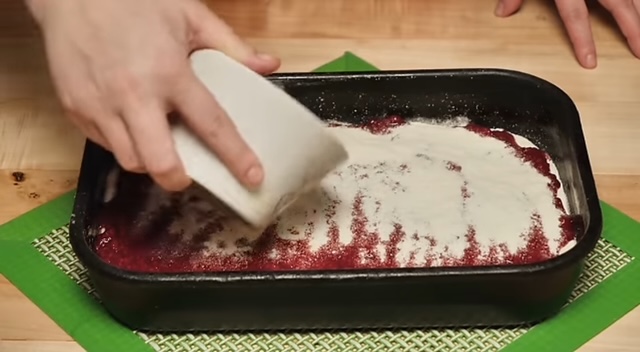 7. Врз малините додајте го вториот дел од сувата смеса (250 г). Нежно протресете го плехот или израмнете со лажица доколку е потребно.