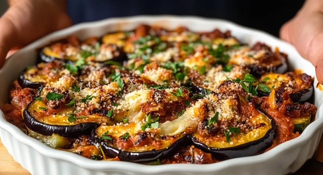 Ова јадење комбинира нежни слоеви модар патлиџан, карамелизиран кромид, ароматична колбасица и богат вкус на кашкавал, завршено со крцкава кора од лебни трошки.