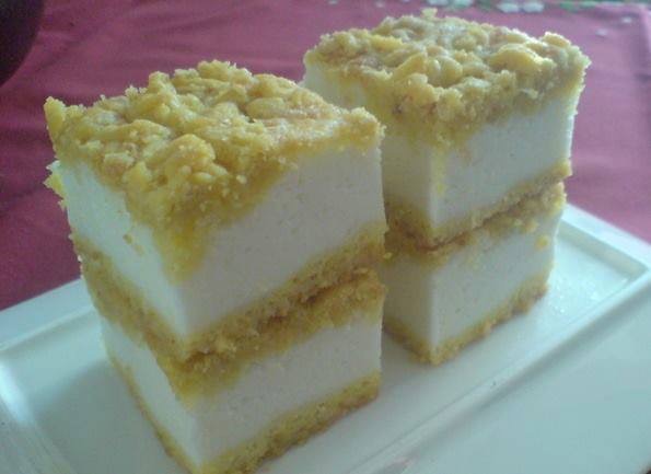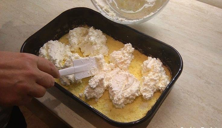 Белките изматете ги со шеќер и додадете рендана лимонова кора. Во друг сад промешајте јогурт и кисела павлака, а потоа со постојано мешање (за да нема грутчиња), додадете брашно. На крај додадете ги и белките во оваа смеса.