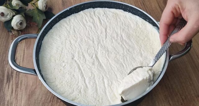 4. Ќе забележите дека количината се намалува – тоа е клучно за добивање цврсто кисело млеко.