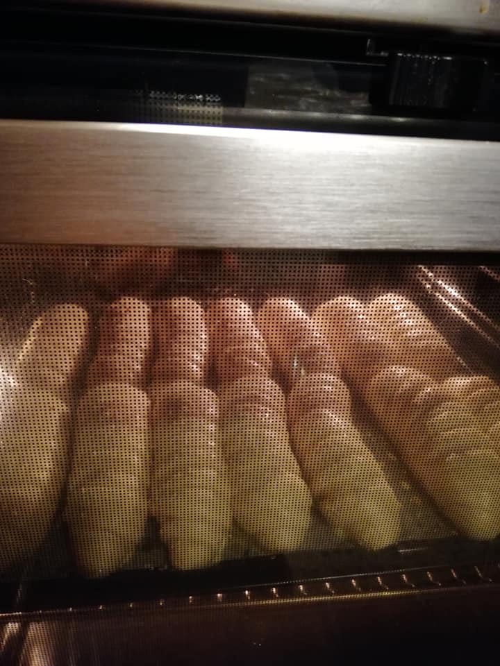 Кифлите редете ги во плех обложен со хартија за печење. Одозгора премачкајте ги со јајце изматено со малку млеко и наросете сусам.