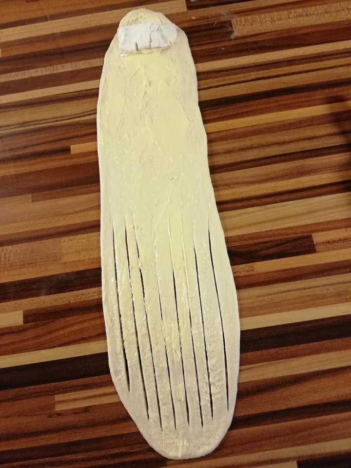 Потоа се формираат кифлите, со кинење од тестото: се формира топче, се расукува долгнавесто, се засекува на еден крај (види фото), на другиот се става сиренце или нешто по вкус, се витка во кифла.
