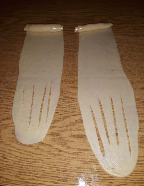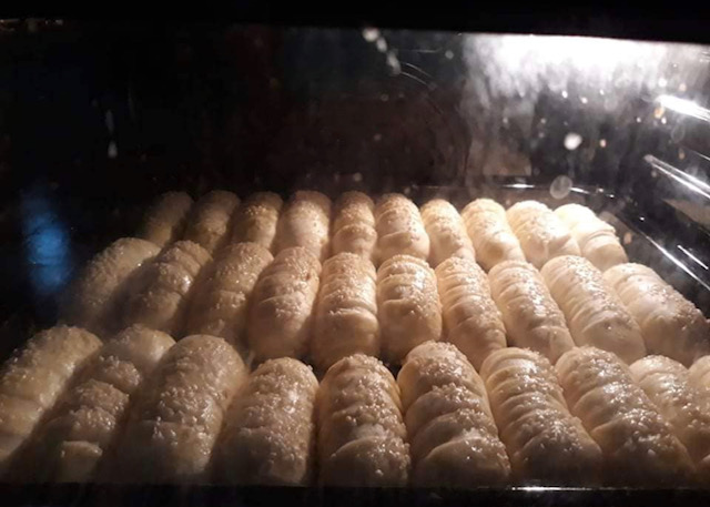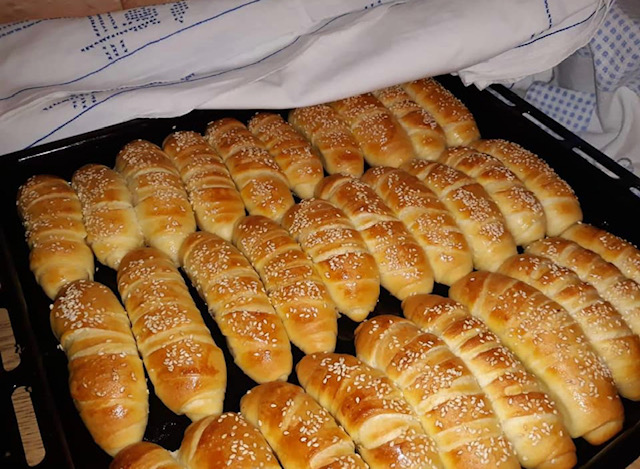 Тестото удрете го 10-тина пати од работната маса, па формираната топка оставете ја на топло за да се удвои, приближно околу 45 минути. Од стасаното тесто се формираат мали топчиња кои се развлекуваат на намастена површина во овални, долги, тенки кори. Се засекуваат од едната страна (види фото) и свиткајте во кифли.