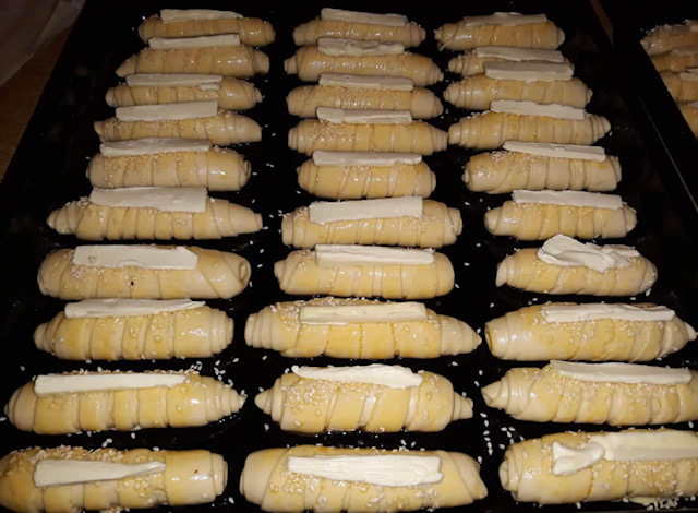 Вака наредените кифли редете ги во плех обложен со хартија и оставете ги 15-тина минути да одморат. Премачкајте ги со јајце, наросете ги со сусам и одозгора ставете парче путер/маргарин (види фото).