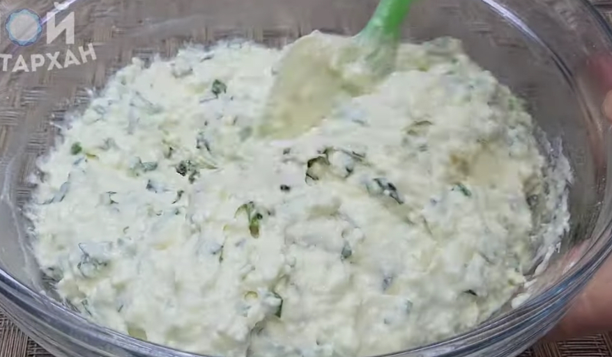 3. Во тестото додајте ја урдата (или ситното сирење), ситно исечканиот спанаќ и ситно исечканиот млад кромид. Добро измешајте за да се соединат состојките.