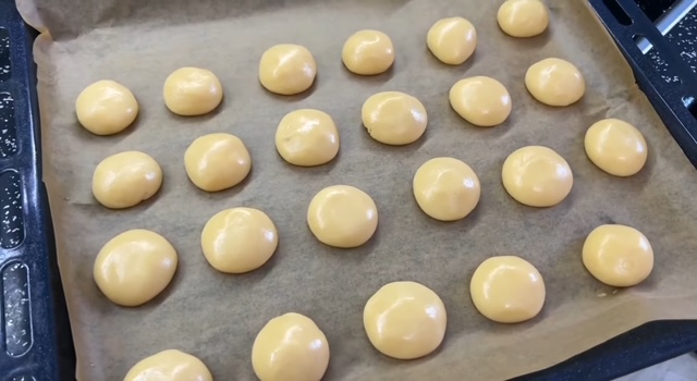 4. Со лажица земајте од тестото и обликувајте топчиња со големина на орев. Наредете ги во плех обложен со хартија за печење, оставајќи мал простор меѓу нив.