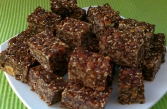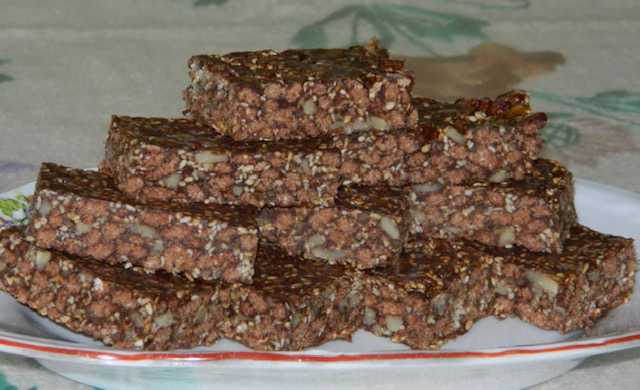 РЕЦЕПТ 1 Фото и рецепт: Наташа Николиќ. Потребни состојки: 150 г шеќер, 7 лажици мед, 200 г маргарин/путер, 100 г чоколадо за готвење, 100 г пропржен сусам, 100 г мелени бисквити, 100 г сечкани ореви, 100 г чоколадни топчиња (Чар на дар) и 1 лист обланда
