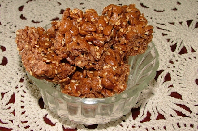 Постапка: На тивок оган растопете 250 г маргарин, мед, шеќер и чоколадо. Во тоа додадете препечен сусам и сечкани ореви. Добиената смеса измешајте ја со чоколадните топчиња. Внимателно мешајте додека да се изедначат состојките.
