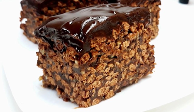 Добиената смеса разлејте ја во претходно подготвената четириаголна тепсија со средна величина, да биде со дебелина на прст. Одозгора прелијте со чоколадна глазура (состојките растопете ги и измешајте ги на тивко). Оставете добро да се стегне, па сечете на коцки.