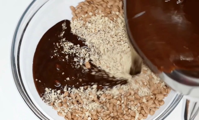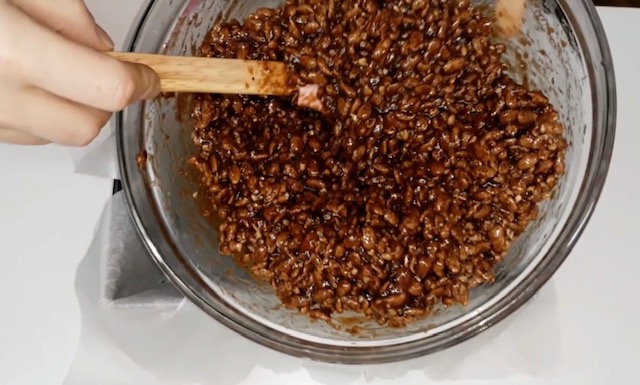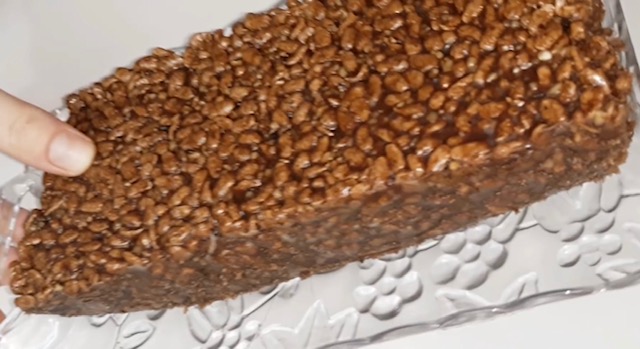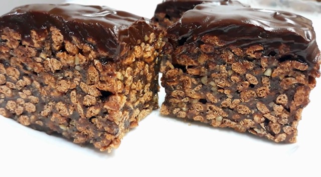 Постапка: Сите состојки растопете ги на тивок оган и прелијте ги преку чоколадните снегулки. Добро соединете, измешајте, а потоа излејте ја смесата во калап и оставете колачот да излади. Потоа прелијте го со чоколадна глазура. Деталите погледнете ги во видеото: