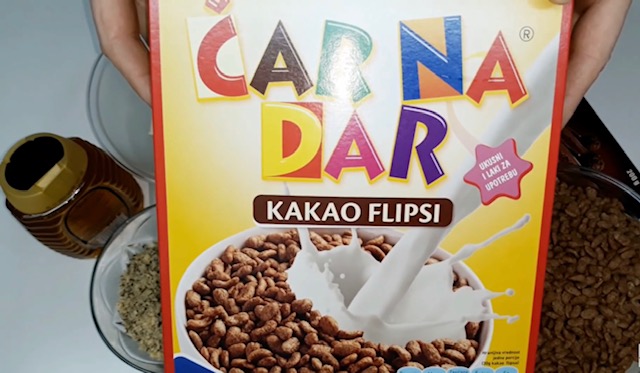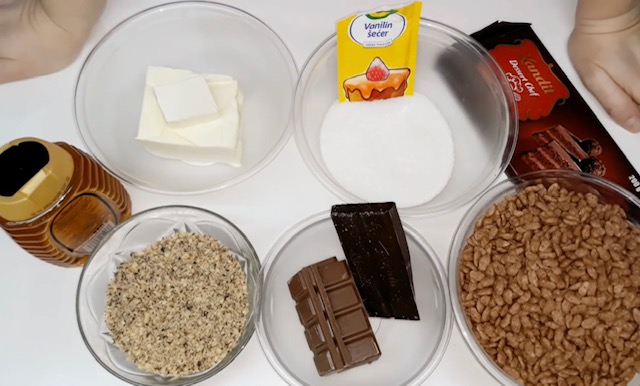 РЕЦЕПТ 2 Потребни состојки: 7 лажици мед, 100 г шеќер, 250 г маргарин, 200 г чоколадо за готвење, 100 г препечен сусам, 150 г сечкани ореви, 1 мала кутија какао флипс (Чар на дар) околу 200 г. За прелив: 150 г чоколадо и 50 г маргарин