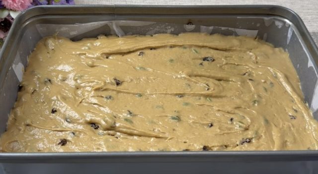 7. Смесата распоредете ја во плех (27×18 см) обложен со хартија за печење.