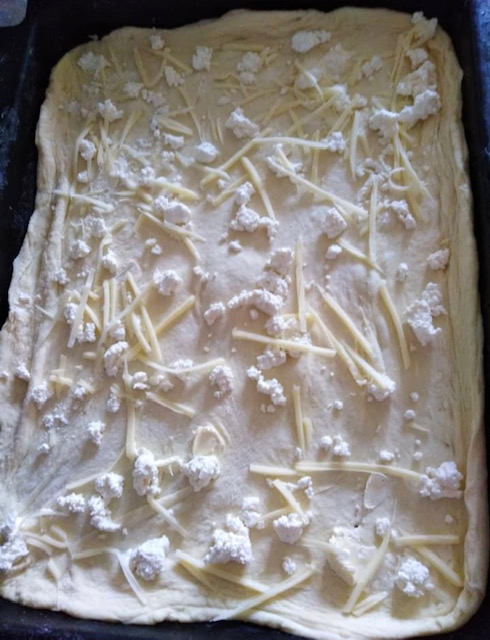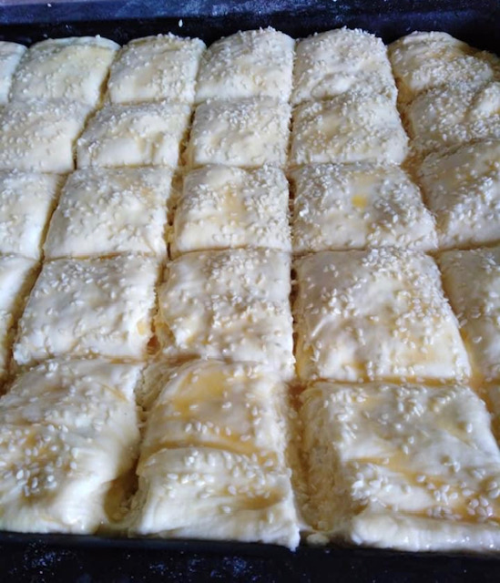 Погачата исечете ја на ромбови или коцки или како сакате, а последната кора премачкајте ја со масло и јајце и наросете ја со сусам. Оставете ја да стаса додека тестото да ја исполни тепсијата и печете ја во загреана рерна на 200 степени додека убаво да зарумени.