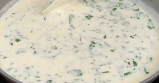 7. Додајте брашно и мешајте кратко, па постепено сипете млеко (или булјон), мешајќи додека да добиете кремаста структура.
