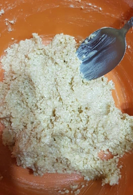 Намалете ја брзината на миксерот, па полека додавајте го брашното. Откако ќе добиете мазна изедначена смеса, додадете го сусамот и со лажица убаво промешајте да се соедини.