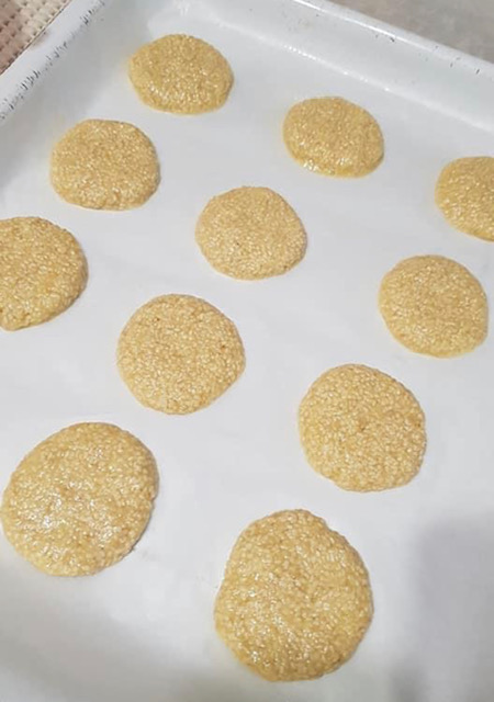 Формирајте ги сусамките и редете ги во плех обложен со хартија за печње. Редете ги на растојание. Ставете ги во претходно загреана рерна на 200 степени да се печат 10 минути. Потоа свртете ги на другата страна и внимавајте да не ги изгорите, бидејќи се тенки и многу брзо се готови. На почетокот се меки, но кога ќе се оладат стануваат крцкави и многу вкусни.